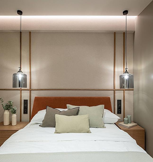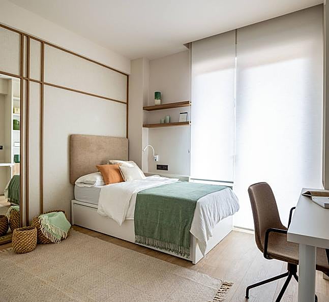 Los dormitorios de la vivienda mantienen un estilo minimalista y la misma sintonía que el resto de la vivienda, excepto una de las habitaciones, que tiene un toque más infantil. En los baños, la cerámica y los tonos beige son los grandes protagonistas, creando un espacio limpio y visualmente armónico. «Se revisten con cerámica hasta dos metros de altura, con el techo y la pared en el mismo tono. Así, se difuminan los límites del espacio y se crea un conjunto a juego con los colores del mueble, dando volumen y profundidad a la estancia», señalan las emprendedoras.