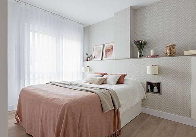 Otro de los grandes retos de la vivienda se encontraba en la habitación principal, donde tuvieron que integrar una columna que caía justo en medio de la zona del cabecero. «Diseñamos un cabecero de obra a medida incorporando la columna original de la vivienda, y también aprovechamos la profundidad para incluir nichos que sirven de mesa de noche, y un zapatero empotrado», comentan.