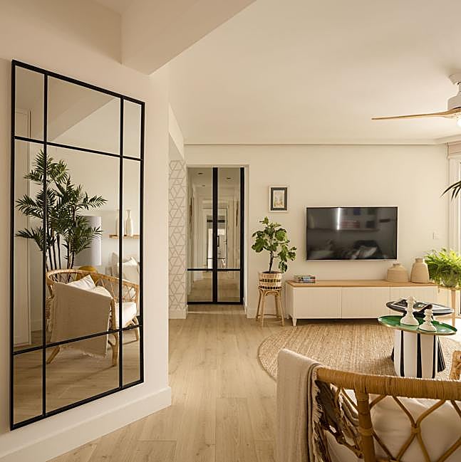 Lo que era un antiguo piso lúgubre, frío y deteriorado por la carcoma en el suelo se ha convertido en una segunda residencia acogedora y moderna para un matrimonio que reside en Bilbao y buscaba un hogar para disfrutar del verano con sus dos hijos adolescentes. «Hemos tirado todos los tabiques y planteado una nueva distribución, porque los propietarios querían tres habitaciones y dos baños. Inicialmente solo había uno, así que hemos jugado con cada centímetro», cuenta la interiorista, que hace un año trasladó su estudio al número 6 de Rodríguez Arias, detrás del Hotel Carlton.