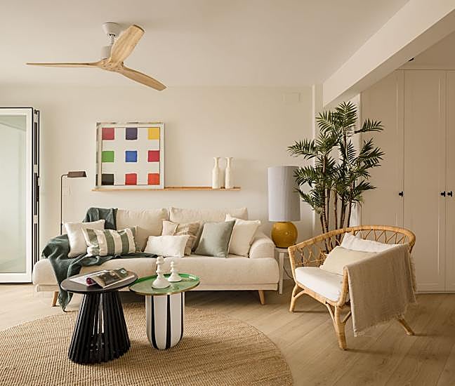 En el salón, predominan los tonos neutros con sofá beige y mueble de televisión lacado en blanco de Kave Home. Para dar un toque de vitalidad, ha introducido acentos de color en elementos decorativos como la lámpara en tono mostaza, las mesas auxiliares y el cuadro, regalo de la familia. «También es importante poner plantas, porque crean un ambiente relajante y hacen las casas más acogedoras», apunta la experta.