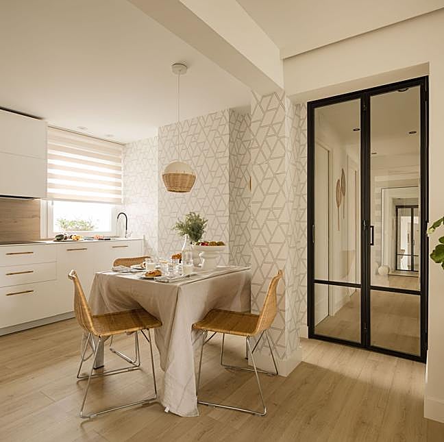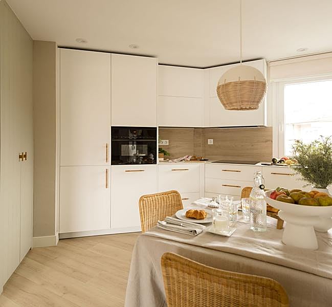 Para ganar espacio en este piso de 75 m2, Irantzu se ha decantado por una cocina abierta al salón. «Los clientes querían que fuese blanca, así que he aportado el toque de calidez con unos tiradores de madera que me encantan y que he usado en otros proyectos, incluso en vestidores», cuenta. En las cocinas abiertas, la interiorista intenta crear continuidad visual utilizando el mismo suelo que en el salón para que el espacio parezca más grande. «Siempre doy mucha importancia a la zona común, porque es el espacio de día en el que se reúnen las familias, que solo suelen ir a su habitación para dormir». Las sillas de rafia y el entrepaño, es decir, el espacio entre el mueble alto y la encimera, en imitación madera hacen la cocina más acogedora. El toque de color lo aportan las puertas de la despensa en verde agua.