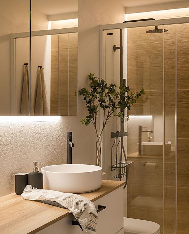 El baño principal, que sigue la misma línea elegante y sobria del dormitorio, cuenta con un espejo en camerino que incluye iluminación LED. «Recuerda al que había en casa de nuestras abuelas, pero actualizado». Las paredes del baño se han revestido con un porcelánico con textura que imita a la piedra natural y aporta un toque muy acogedor. Los perfiles de la mampara, lacados en blanco, contrastan con la grifería en negro.