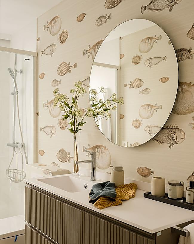 Y, por último, el baño de los hijos adolescentes, donde todo el protagonismo se lo lleva el papel pintado con peces globo de la firma Cole & Son. «En esta casa no he seguido un estilo específico, todo ha sido ecléctico. El proyecto se ha adaptado a los gustos y necesidades de los clientes, explorando elementos de diferentes estilos, como el nórdico, el clásico moderno, el romántico y el minimalismo», apunta la interiorista bilbaína.
