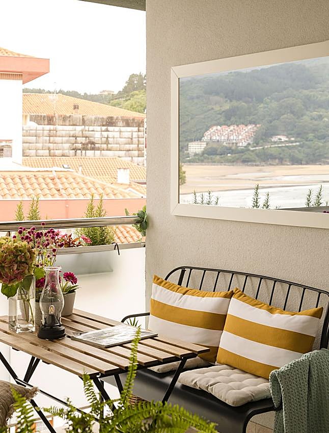La vivienda también cuenta con una pequeña terraza a la que ha intentado sacar el máximo partido. «Hemos optado por una puerta corredera plegable para que quede totalmente abierta, sin ningún perfil. Al tratarse de una terracita con techo, casi nunca la cierran». Además de optimizar el espacio, Irantzu buscaba que pudiesen contemplar mejor las maravillosas vistas a Urdaibai. «Puse un espejo porque me daba pena que tuviesen que asomarse para disfrutar de una preciosa panorámica de la playa de Laida. Ahora hasta desde la cocina pueden ver el mar».