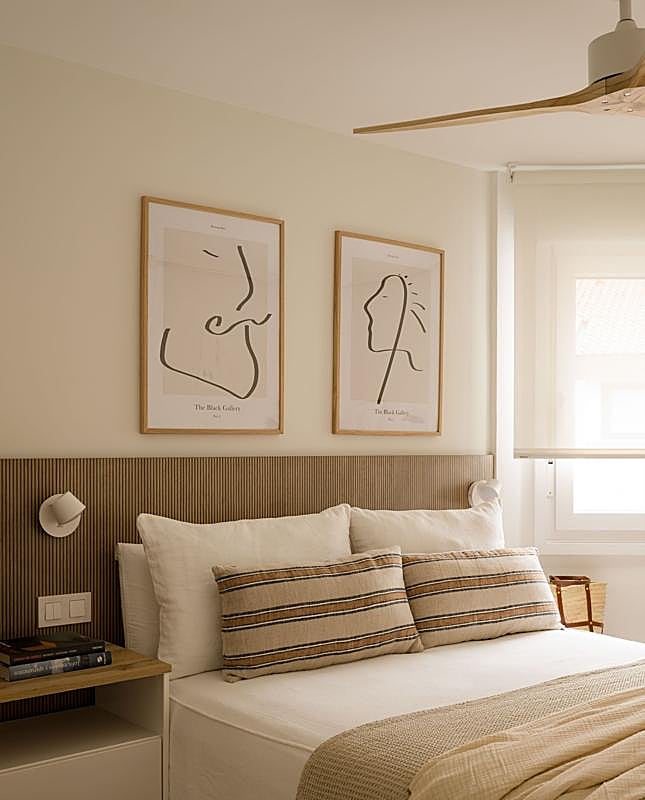 En el dormitorio principal, destaca un cabecero a medida, que va de un lado al otro de la pared, a juego con el escritorio en nogal. Pese a su reducido tamaño y a que el apartamento cuenta con «numerosas paredes a 45 grados, que dificultaban la distribución de los espacios», la habitación dispone también de un armario empotrado de dos metros. Los tonos neutros de toda la estancia invitan a la relajación y el descanso.