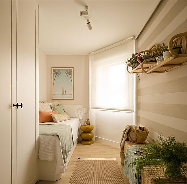 En el dormitorio de la niña, Irantzu juega con un papel pintado con textura y con otro de rayas horizontales, que resultan «más modernas que las verticales». Las baldas y el banco de rafia hacen la estancia más acogedora.