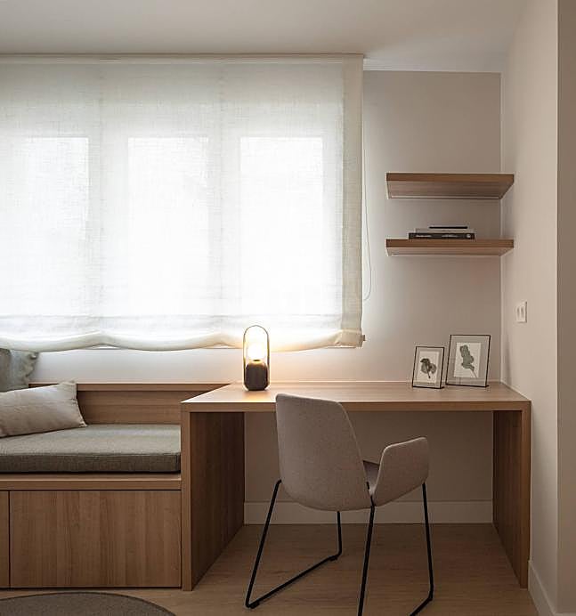 La iluminación ha sido otro aspecto muy cuidado. Las emprendedoras han trabajado la luz indirecta para transmitir una sensación placentera, sobre todo, de noche. Entre las firmas del mobiliario, destacan las siguientes: el puf de la entrada de Sancal, las mesas de centro de Stua, la alfombra del salón de KP, los taburetes de la cocina de Inclass y las mesas del dormitorio principal de Treku. Además, las cortinas están confeccionadas por Toral Decoración, cuya tienda se ubica en Las Arenas.