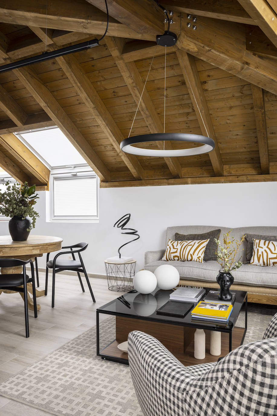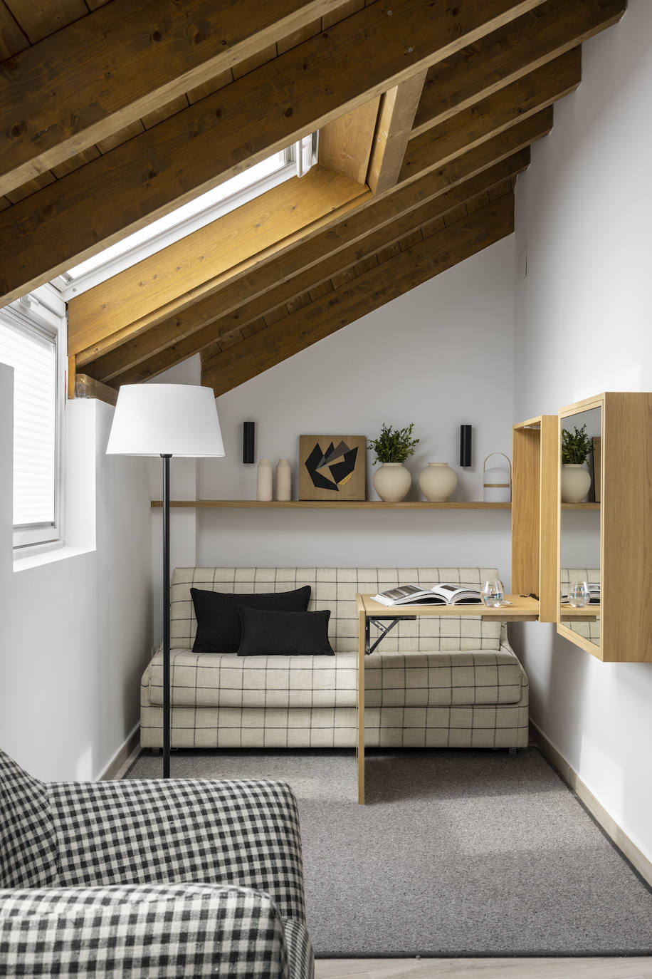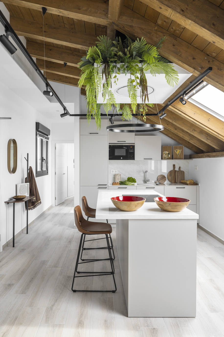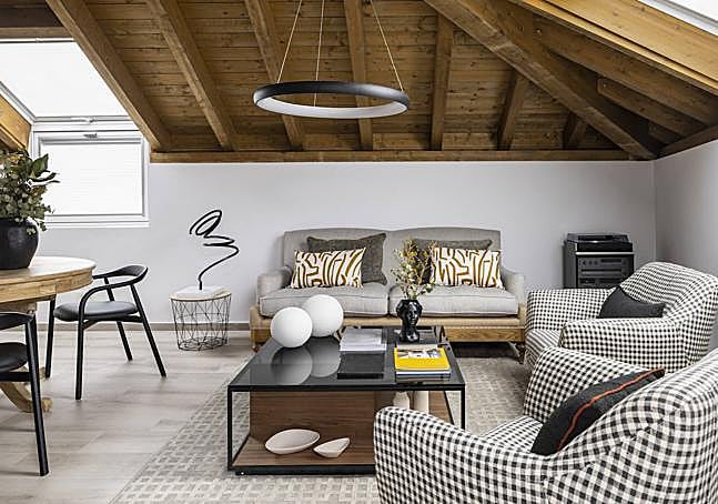 Con todo ello, Raquel ha conseguido crear una vivienda cómoda, elegante y llena de luz. «Destacaría la combinación del techo abuhardillado con vigas de madera en tonos cálidos para conseguir un ambiente acogedor y luminoso. Y también el cuadro vichy de las butacas. Nos chifla», concluye.