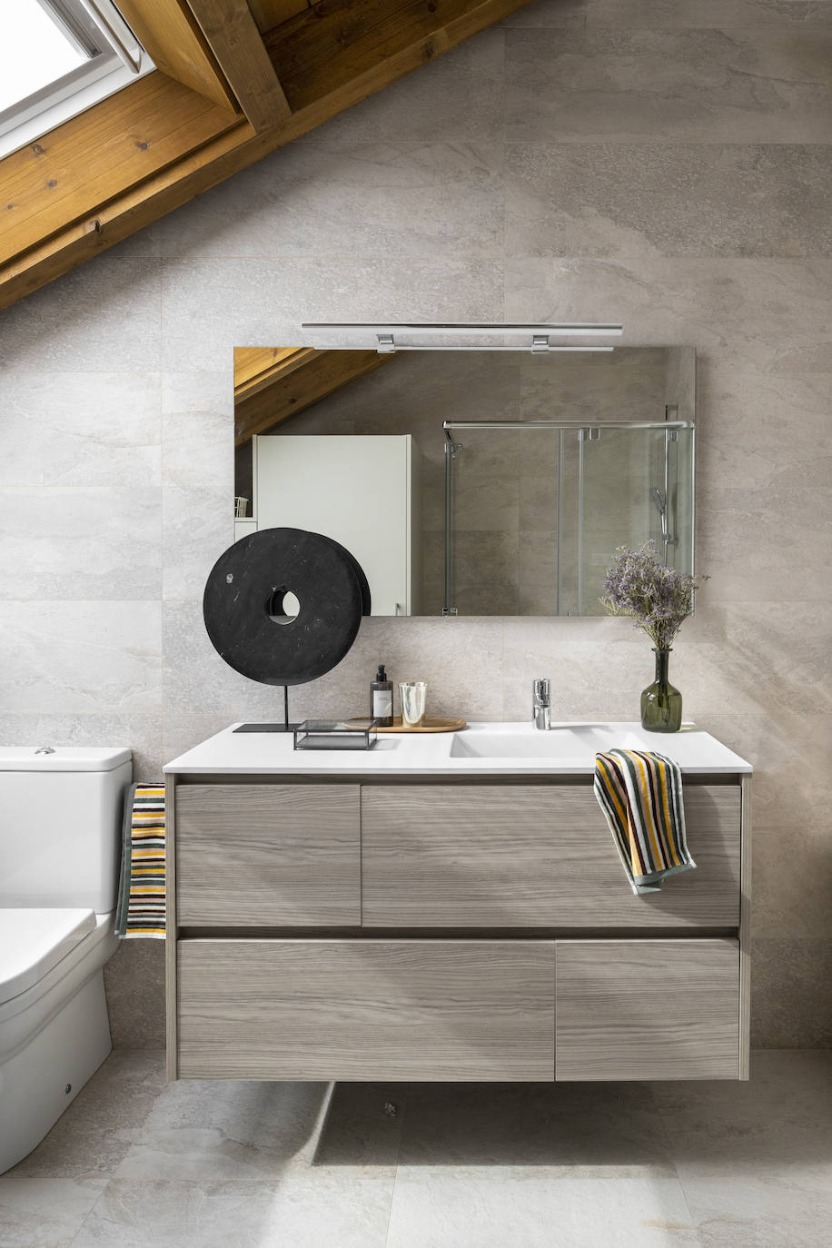 Finalmente, en el cuarto de baño, ha elegido la misma línea visual que en el resto de la casa: utilizar la paleta de colores beige y neutros. Con la idea de ganar almacenaje, se ha instalado un mueble de apoyo al lado de la ducha con gran capacidad. Entre las firmas del mobiliario destacan las siguientes: los taburetes de Kave Home; el sofá de dos plazas de Crearte; las fuentes de madera sobre la isla de Arbe; la mesa de centro de Kendo; los cojines estampados de Pepe Peñalver; la alfombra de Gancedo o el sillón de Casual, entre otras.