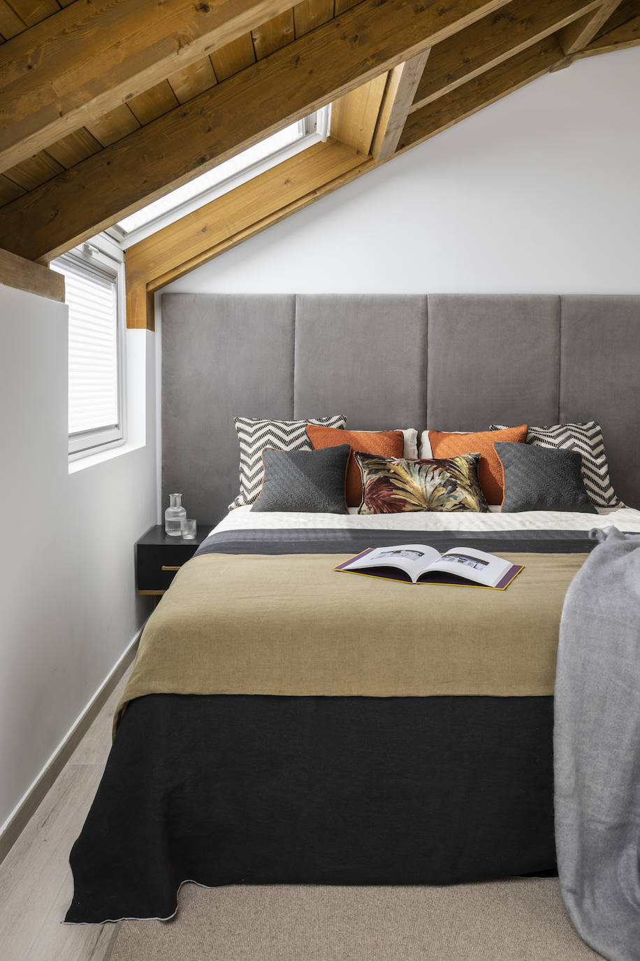 La interiorista señala que la disposición tan particular con diagonales, chaflanes y ventanas en cubierta fue «todo un reto». Al ático se accede a través de una zona central integrada que incluye vestíbulo, cocina, comedor y salón; es el corazón de la casa y conduce a las demás estancias. En un lado de la planta, se encuentra el dormitorio de invitados, que también funciona como despacho, y en el otro lado, el dormitorio principal con su baño. «La decisión final fue crear un diseño moderno y despejado que tuviera varios usos y consiguiera una sensación de unidad a través de visuales amplias», explica.
