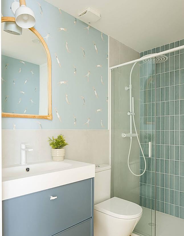 La paleta de tonalidades se convierte en el hilo conductor de la vivienda. Ane y Fernanda también han utilizado los verdes, terracotas y mostazas para conseguir un ambiente veraniego y desenfadado. Además, han jugado con los textiles para dotar a la vivienda de mayor calidez, como es el caso de las alfombras. En los baños han optado por variedad de colores; uno de ellos tiene un estilo más sobrio con tonos neutros, y al otro le han dado un toque más divertido; es de color azul y tiene un papel de nadadoras 'vintage' muy original.