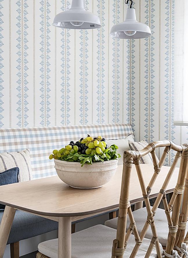 En la zona office, se ha utilizado el mismo papel que en la cocina y se han escogido textiles a juego con estampado vichy que, combinados con mobiliario en madera, generan un rincón familiar, cálido y acogedor dentro de la cocina. «Cuando vi este papel me enamoré de él y cuando hablé con Iratxe de escoger el azul como hilo conductor, sabía que iba a quedar como anillo al dedo y así fue», afirma la decoradora.