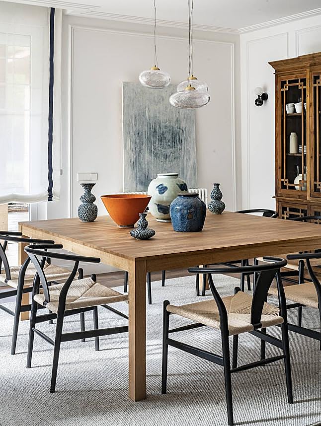 La mesa del comedor se diseñó a medida, a juego con una vitrina donde poder almacenar, principalmente, la vajilla y la cristalería, y se escogieron unas sillas inspiradas en la CH24 de Carl Hansen.