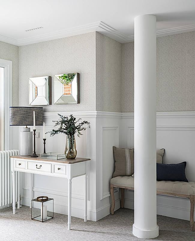 El primer reto fue distribuir los espacios. Se deshicieron de tabiques para que la luz natural llegara a todas las estancias y unificaron todo a efectos de iluminación, carpinterías, suelos e instalaciones. La mezcla de estilos y molduras, baquetones y frisos que revisten la casa consiguen un toque clásico y actual muy característico de Raquel. «Yo me adapto a los gustos y las necesidades de los clientes e intento que todo tenga una coherencia en el estilo. De hecho, el color azul se marcó como hilo conductor en toda la vivienda. He perseguido la armonía estética que busca Iratxe en sus pacientes de sus clínicas de Bilbao y Vitoria», afirma Raquel.