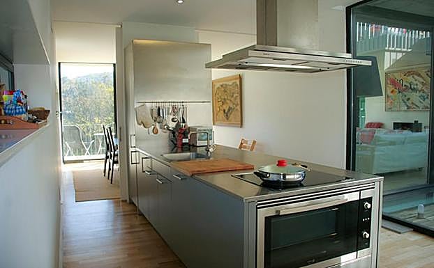 Esta casa en Plentzia cuenta con una cocina de diseño, absolutamente preparada para el cocinado de suculentos platos con los productos del mar. La encimera de acero inoxidable es la superficie perfecta para trabajar. Muebles y electrodomésticos forman un solo bloque en el centro de la estancia, es realmente sorprendente.