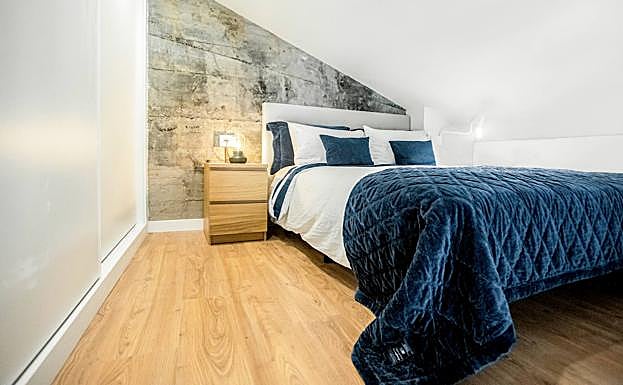La esencia de la vivienda se ha mantenido también en el elegante dormitorio de la segunda planta. El hormigón y la estructura del ascensor son originales, lo cual aporta calidez y un toque de carácter. Los materiales tan puros ayudan a que parezca limpia y sofisticada. Además, el dormitorio cuenta con un buen armario de 2,5 metros que ayuda a resolver cualquier problema en cuanto a almacenaje de ropa y calzado. La luz es cálida e invita a acomodarse cómodamente bajo el techo abuhardillado. El resultado, un espectacular y funcional 'mini-piso' que cuenta con todas las comodidades.