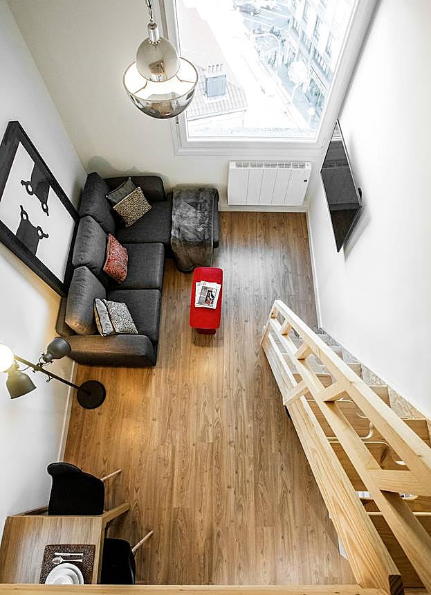 Borja Vildósola, de 30 años, reformó la vivienda del portero de 19 metros cuadrados, aprovechando su altura para construir una entreplanta y ampliar el espacio siete metros más, logrando así un coqueto ático sólo apto para los más minimalistas
