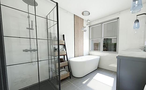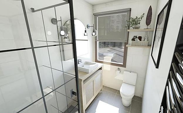 Este baño es un ejemplo de claridad de líneas, pero también de iluminación. Detalles como la delicada mampara de ducha, el lavabo sobre encimera o el seca toallas negro son sin duda aspectos que enriquecen el conjunto para aportar mucha personalidad a una estancia que a priori no le damos.
