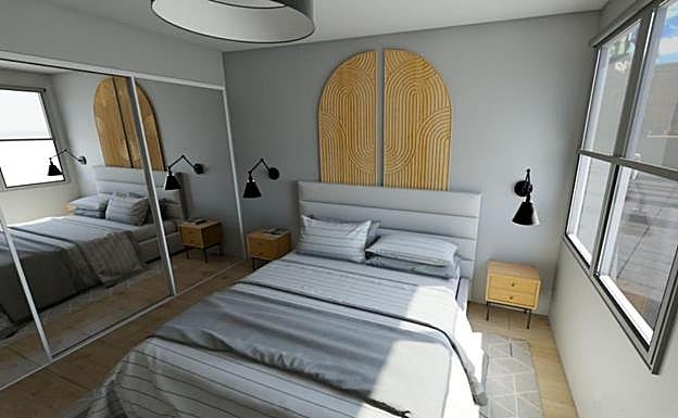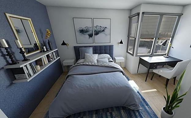 En este dormitorio hay espacio para todo. Al pintar una pared de azul ya podemos empezar a jugar con el resto de los elementos. La ropa de cama o los muebles dan forma así a un interior que permitirá relajarnos y hacer que nuestro sueño sea realmente reparador.