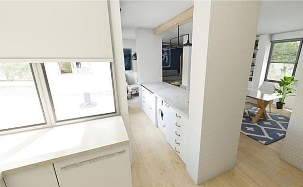 La cocina cuenta con un anexo donde se encuentra la lavadora y más espacio de almacenamiento. Un pasaplatos amplio conecta todo con el comedor. En este rincón también hay una ventana para que no eches de menos la luz natural en ningún momento.