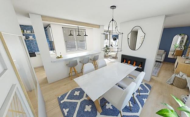Luz y mucho espacio vas a encontrar en el comedor. El pasaplatos ha sido aprovechado para colocar una barra para desayuno. Caben estanterías una mesa central para comer, cenar o celebrar. Un detalle curioso es la chimenea doble instalada en una pared que comparte con el salón.