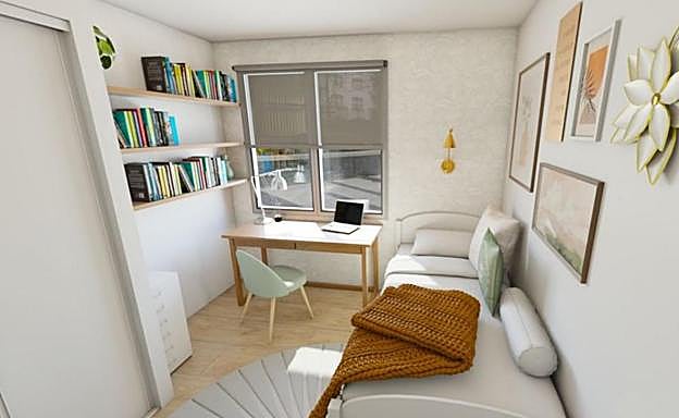 Esta habitación es perfecta para el más peque de la casa si lo tuvieras. Tendrá su escritorio para estudiar. Un armario empotrado solucionará sus problemas de almacenamiento. En la pared de la ventana se ha colocado un papel decorativo en tonos claros para facilitar la relajación.