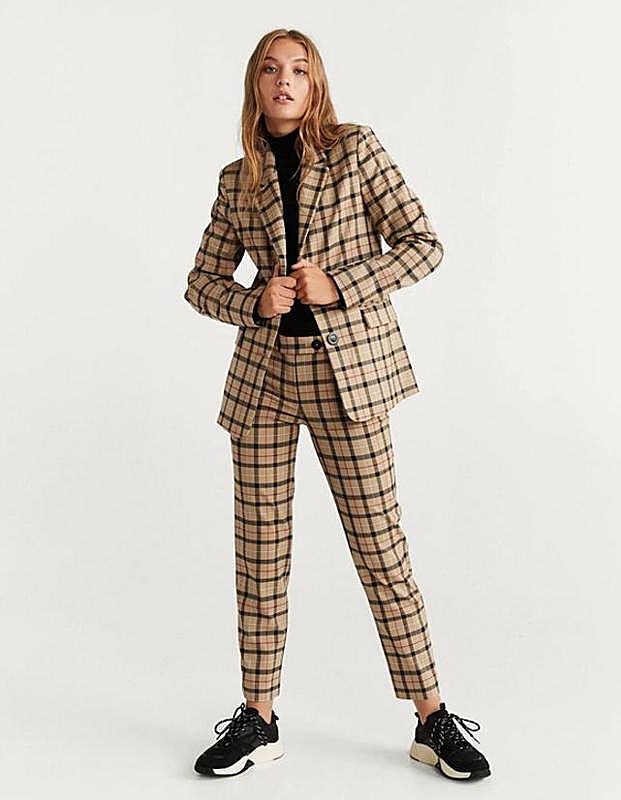 Los cuadros british se pueden llevar de muchas formas pero nos gusta especialmente esta, que nos permite jugar con el beige y el negro en el resto de nuestro estilismo. Es de Mango y de 59,99 euros ha pasado a costar 39,99. Solo queda en la XS.