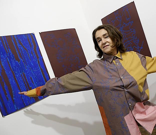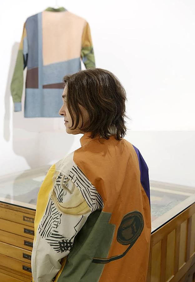 En otro rincón de la galería, también se presentan trabajos más recientes de la artista vasca. «Se trata de textiles impresos con diseños geométricos, a los que posteriormente he intervenido con pintura, serigrafía y dibujos elaborados a pastel y con la técnica gouache», cuenta. Además, en un gran mueble de madera, situado junto a la entrada, donde también se muestran dos de las camisas que había ideado para la convocatoria 'Tras la Tormenta' - la tercera cuelga en una percha próxima- , la artista vasca ofrece algunos pañuelos de seda con sus estampados más recientes.