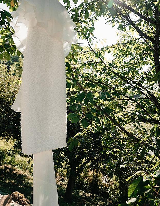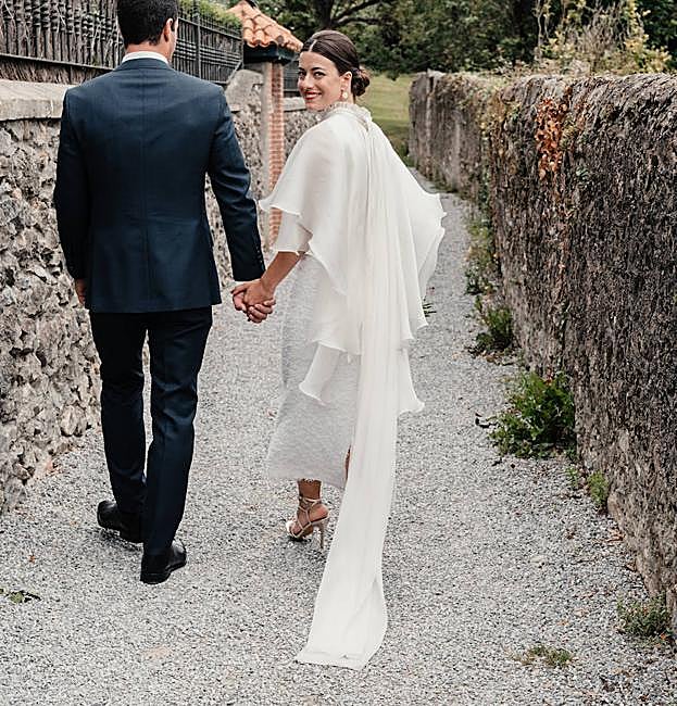 Para el día de su boda, Naia optó por un diseño del maestro Javier Barroeta. Un vestido entallado 'midi' con amplio escote en pico en la espalda elaborado en Chanel de algodón y seda. Su propuesta nupcial incluye una capa asimétrica en organza rematada con cuello y una larga lazada en la parte trasera. Un accesorio del que Naia se desprendió en el convite para crear el deseado efecto sorpresa. El proceso del vestido se prolongó de enero a una semana previa al enlace. «Llevé al atelier un montón de fotos de cómo lo quería: de la cola, del cuello... y Barroeta lo mezcló todo para hacer un vestido nuevo. Lo dibujó y cuándo lo vi me pareció precioso. Le dije que era justo lo que quería, no tuve ninguna duda», cuenta. Eso sí, durante las seis pruebas que concretaron, Naia fue añadiendo y cambiando nuevos detalles al vestido. «Cada vez que me lo ponía se me ocurría una idea nueva. Lo terminamos al límite», asegura entre risas.