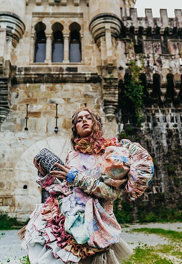 Después, se dirigieron al castillo de Butrón, en Gatika. Esta vez, los looks tenían inspiración victoriana. En el shooting, tuvo especial protagonismo un voluminoso vestido amarillo ideado por el bilbaíno Alberto Etxebarrieta para su firma Sinpatron, una marca que no sigue las normas y convierte la moda en diversión. «Le conocí en un viaje y me encantó su firma. Le prometí que cuando tuviera la oportunidad de hacer una sesión en Bizkaia iba a contar con sus diseños», cuenta Adrián. Junto a esta escenificación que parece haber salido de un cuento de hadas, tuvo lugar el momento más surrealista de la sesión. «A los modelos les empezamos a grabar TikToks vestidos de época. Pasado y futuro se daban la mano en la misma imagen», añade el estilista.