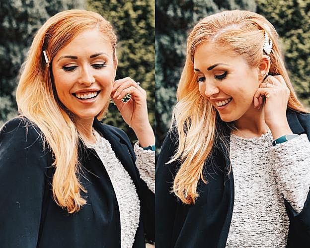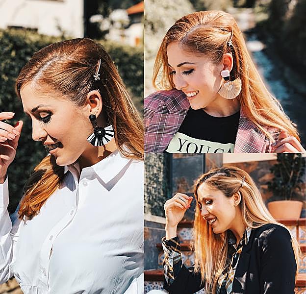 Es la forma más fácil de incluir las horquillas en tu look si aún no estás demasiado familiarizada con ellas. De este modo, retiran la melena de un solo lado, consiguiendo todo el protagonismo. Me gusta mucho combinarlas con unos pendientes llamativos, siempre que la horquilla no sea demasiado grande. Creo que le da un toque muy personal. En el collage podéis ver cómo quedan con pendientes XL y otras piezas más minimales. El modelo que llevo en la imagen de la izquierda es de oro rosa con brillantes. Lo compré en Bijou Brigitte y es el mismo que aparece en la imagen superior derecha. La pieza que llevo debajo, sin embargo, es de Ponette y se trata de un diseño muy sutil que incorpora pequeños brillantes morados.