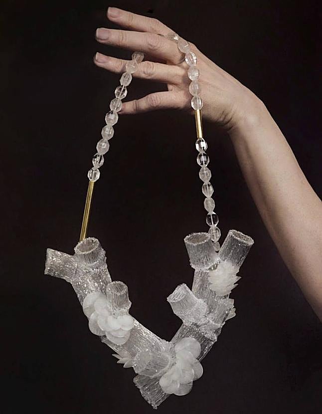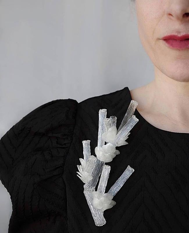 En sus propuestas hay una fuerte vinculación con el mundo del arte. En ellas conviven procesos artesanales con los últimos avances técnicos, que permiten mayor experimentación. «Dedico muchos esfuerzos a la investigación para encontrar soluciones técnicas que me permitan crear las piezas. Me fijo en la ciencia y la belleza de la naturaleza. Por ejemplo, tengo una línea inspirada en el hielo, porque me interesa cómo cambia el agua en función de la temperatura. Las personas no somos diferentes a estos procesos naturales, también cambiamos según el entorno», explica. En su trabajo la búsqueda estética comparte protagonismo con la investigación sobre materiales. «Me interesan aquellos que cambian su forma a través del calor, como el agua. He trabajado con gomas termorretráctiles, con resinas epoxi... y ahora con ácido poliláctico», cuenta.