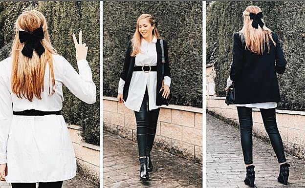 'Black and white' es una combinación que nunca falla y en este outfit ¡me encanta! Me parece perfecto para trabajar o para simplemente dar una imagen cuidada y profesional, en este look a parte del lazo en un semi recogido en el pelo he añadido también una maxi camisa, que se van a llevar un montón también esta temporada y de la que os hablaré muy pronto en un post. Tanto el lazo como la camisa y los pantalones encerados son de Stradivarius, la blazer y el cinturón es de Zara, los botines son de José Sainz y el bolso es de Martina K.