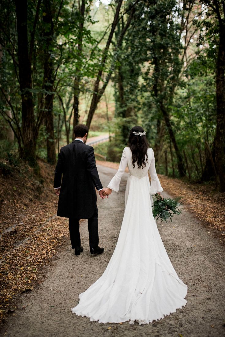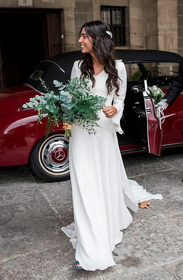 El secreto mejor guardado de la novia, su vestido, se confeccionó con mimo y durante meses en el atelier de alta costura de Miriam Gálvez, situado en la calle Menéndez Pidal de Madrid. Esta diseñadora nupcial lleva más de 20 años trabajando en el sector y supo entender al instante lo que Laura buscaba para su gran día. Tan solo hubo que seguir cuatro requisitos básicos: que fuera un diseño ligero, con caída, manga larga y escote en pico. Por eso, eligieron un crepé ligero cubierto con georgette, liviano y ágil, que le aportaba ese movimiento tan especial al caminar. «El resto lo fuimos creando sobre la marcha en cada prueba», asegura esta novia, natural de Getxo. De este modo, se añadieron sutiles detalles de encaje, unos pequeños botones-joya y unas mangas tres cuartos acampanadas que daban personalidad al conjunto.