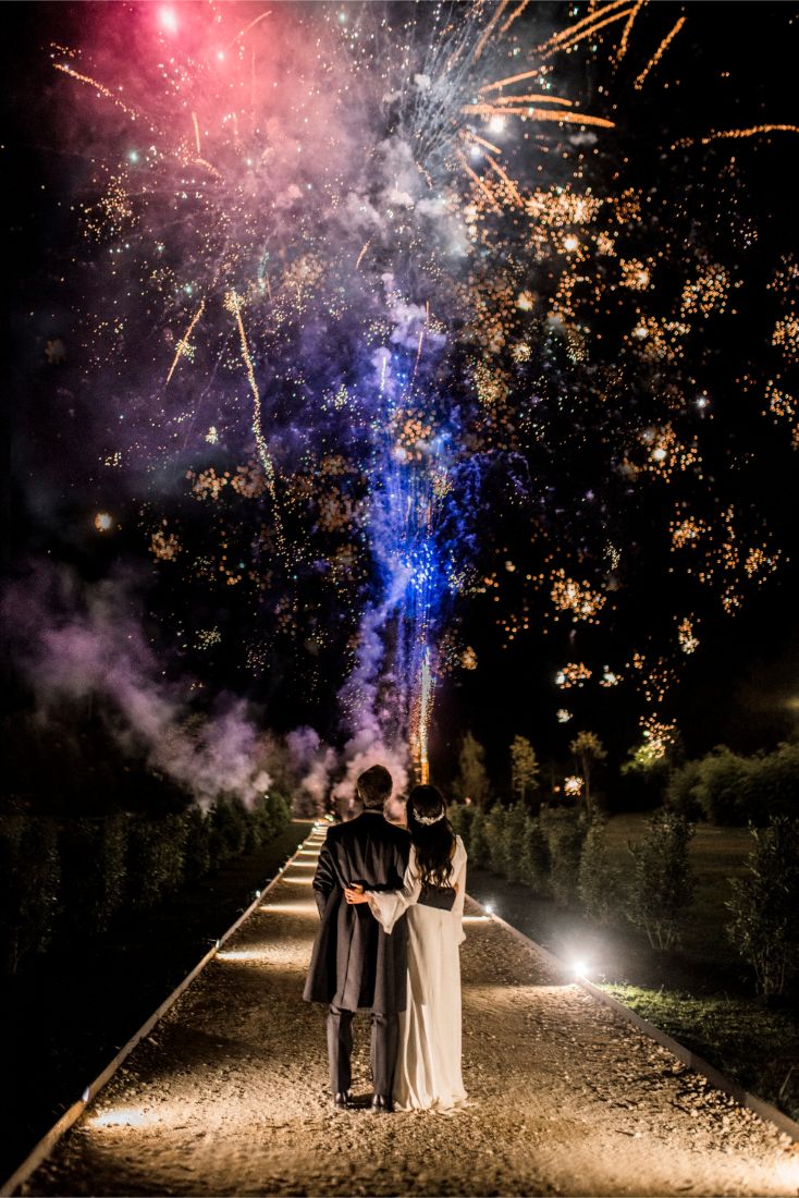 En cuanto al calzado, sí que guardó una segunda opción en la recámara. Para la ceremonia, eligió unos zapatos de Jimmy Choo en color verde petróleo, muy cómodos, que le regaló una de sus mejores amigas. Para la cena y la fiesta, los cambió por unas alpargatas todoterreno de Castañer, también regalo de otra de sus amigas, con las que pudo bailar toda la noche. Y fue, precisamente, en el baile cuando se produjo uno de los momentos más emotivos de la velada. «Los hermanos de Bari nos sorprendieron con unos fuegos artificiales que nos dejaron a todos con la boca abierta», recuerda.