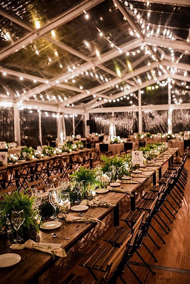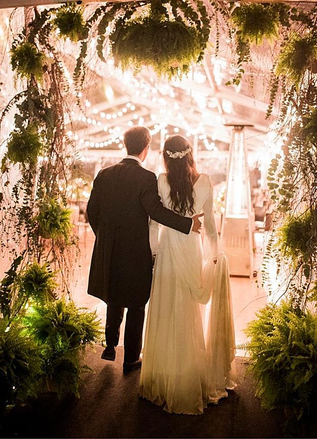 También supo hacer su particular magia en el Palacio de Ubieta que, por aquel entonces, aún no contaba con la carpa que tienen en la actualidad. Por eso, montaron la suya propia. «Al ser una boda de noche nos decantamos por una carpa transparente a dos aguas, iluminada por guirnaldas de luz cálida. Tiene la peculiaridad de que no se puede instalar en una boda de día dado su efecto invernadero», concreta. «La situamos en el terreno trasero del palacio para no desvelar de primeras la magia de las velas, los helechos, las guirnaldas de microbombillas y del comedor en sí». Además, se añadieron estufas piramidales de llama que garantizaron la temperatura perfecta durante la cena. Las mesas estaban vestidas con mantelería de lino beige y mesas alargadas de madera vista, creadas con antiguas puertas de madera. Todas ellas decoradas con muchas velas y centros florales que combinó como nadie Mar de Garden Center.