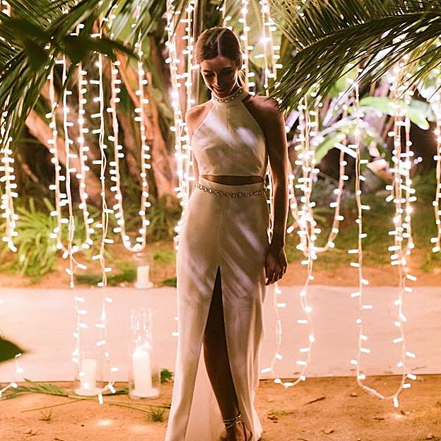 Para la fiesta posterior, la modelo cambió su vestido por un diseño perfecto para bailar toda la noche. Siguiendo las tendencias actuales, eligió un dos piezas con cuerpo 'crop' de escote 'halter' y una falda de talle alto con abertura frontal, ambos bordados con una cenefa de aplicaciones-joya.