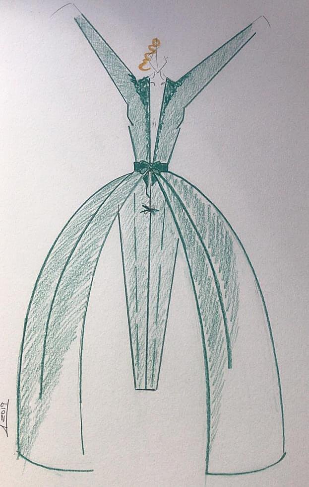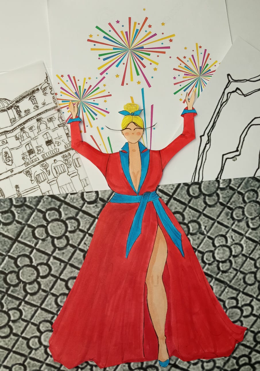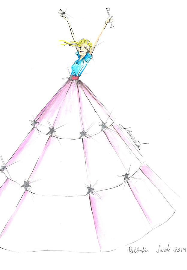 Cuando a Maialen Illescas se le propuso diseñar un vestido a Marijaia sintió tantas ganas como miedos. Por un lado, estaba «emocionadísima y agradecida por este reto personal», pero a la vez tenía dudas de hacerlo bien. «¿Y si no estoy a la altura? ¡Mira qué diseñadores participan!». Estuvo a punto de echarse para atrás –«no me va a dar tiempo, no quiero entregar un churro»-, pero finalmente esta diseñadora duranguesa de 28 años, fundadora de la firma Dossis Designs junto a su hermana y su madre, también modista, afrontó sus inseguridades y se puso a dibujar. Tras horas sentada en un mesa, tirando papeles al suelo «como en las películas», encontró la inspiración. «Ya lo tengo, espero que te guste, es muy loco pero creo que con la explicación se entenderá», dijo emocionada por WhatsApp antes de enviar las fotografías de su Maridiva, una mujer moderna, transgresora y libre. «Yo en Marijaia veo a una señora muy rural, una aldeana divertida con la que te dan ganas de salir de fiesta y esto último es precisamente lo que reivindico con mi marca: la importancia de disfrutar de la vida.» De ahí que mantuviese sus característicos coloretes, que «son muy simpáticos», y sus brazos en alto. Eso sí, ha dibujado a su Maridiva de espaldas, mirando hacia el futuro, para simbolizar a una mujer del siglo XXI que se adapta a los nuevos tiempos.