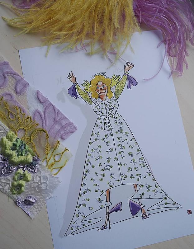 Eder la imagina enfundada en un vestido tipo gabardina en color blanco que lleva bordadas flores verdes y lilas de lúrex. El tejido empleado es una seda proveniente de Suiza, única en el mundo, que ha comprado en la empresa familiar de tejidos Rafael Matías del Casco Viejo. Se trata de un diseño que incorpora un cinturón que enmarca una silueta con bajo asimétrico, más largo por detrás. Las mangas, ligeramente abullonadas, las confeccionaría en organza de seda con detalles bordados en color lima. Como si fuese una gran diva, de sus hombros sobresalen unas plumas de marabú en tonos verde lima y violeta. Además, en las muñecas lleva unos lazos morados de encaje que le aportan un aire aún más especial y que combinan a la perfección con sus sandalias minimal con tacón de aguja. El toque gamberro lo consigue con la capucha de la gabardina, también violeta y de encaje, que vendría muy bien a su Mariederrah para protegerse del sirimiri.