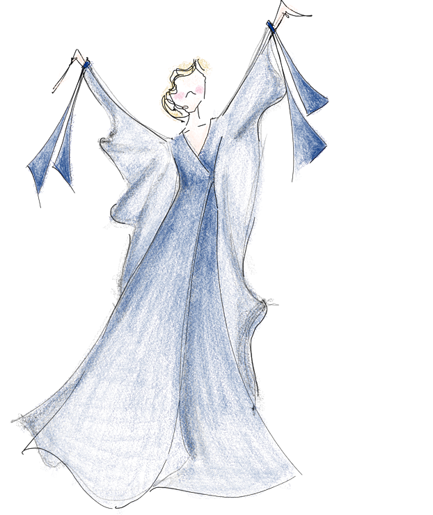 Desde Sophie et voilà han querido plasmar «la fuerza y feminidad» de Marijaia en este diseño de líneas limpias y depuradas. Su Maristicada, como han querido llamarla por ser «una mujer sofisticada y muy chic», luce un elegante vestido cruzado con escote en V. La diseñadora bilbaína Sofía Arribas, fundadora de la firma, lo confeccionaría con varias capas de muselina de seda para lograr un efecto degradado en 'azul Bilbao'. Además, su reina de la fiesta lleva unas mangas tipo ángel que van sujetas a la muñeca, fusionándose visualmente con el cielo de la villa y permitiendo a su Maristicada libertad de movimiento para poder bailar sin parar durante los ocho días de fiesta. «La delicadeza de las mangas constrasta con la rotundidad de sus brazos en alto. Es una forma de encontrar el equilibrio», explica Sofía, especializada en moda nupcial e invitadas.