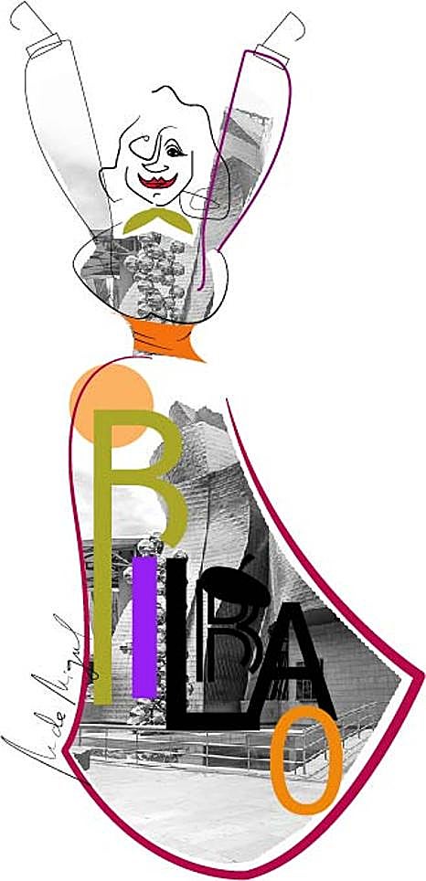 Mercedes de Miguel se ha decantado por una ilustración digital para dar a su Marifiestas un aire más novedoso y vanguardista. La diseñadora se imagina a nuestra embajadora de Aste Nagusia enfundada en un vestido de algodón satinado, un «tejido ligero muy apropiado para el verano». Eso sí, la invita a desprenderse del mítico estampado de flores para defender un diseño «mucho más bilbaíno». Mercedes ha plasmado en su vestido el Guggenheim, por ser el «mayor icono de la regeneración de la villa». Y por encima del museo sobresale la palabra Bilbao, con txapela incluida encima de la segunda 'b'. «En un principio, pensé hacer todo el vestido en blanco y negro, para que fuese más sobrio, pero no podía prescindir del color, una característica esencial de Marijaia», afirma.
