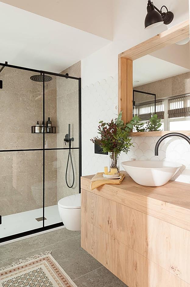 El baño sigue la línea de la casa en cuanto a la utilización de materiales cerámicos. En esta ocasión, la interiorista se decantó por un mueble con espejo de roble natural y una encimera elaborada a medida. «También hemos puesto una grifería empotrada para facilitar la limpieza y una gran ducha acristalada», añade.