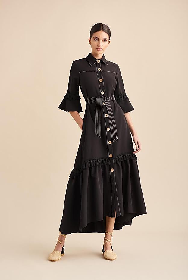 Se trata de un vestido camisero con toques de tendencia en sus acabados, que pertenece a la nueva colección, bautizada con el nombre de 'Raízes'. Es un diseño con manga tres cuartos rematada en volante y tiene una largura 'midi' asimétrica, más corta por delante y larga por detrás. Además, está ribeteado en beige, tiene botonadura de coco, flecos de pasamanería e incorpora un cinturón que introduce cierto toque étnico al conjunto. Un accesorio muy a tener en cuenta para este verano en el que los diseñadores lo proponen, sobre todo, con vestidos largos, holgados y tipo caftán o túnica.