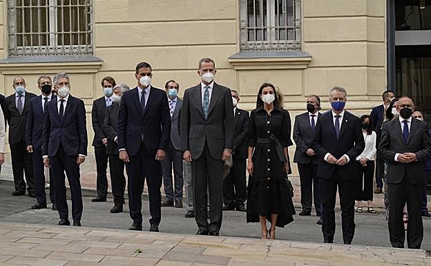El rey Felipe VI y doña Letizia han vuelto a Euskadi para asistir a la inauguración del Memorial de las Víctimas del Terrorismo, levantado en la antigua sede del Banco de España en Vitoria. El centro, que busca ser referente en el recuerdo de la barbarie y el respaldo a los damnificados por todo tipo de violencia terrorista, lleva un año listo para abrir sus puertas, pero la crisis sanitaria y la dificultad para cuadrar las agencias de los asistentes han demorado el acto más de la cuenta. En compañía del lehendakari, Iñigo Urkullu, el presidente del Gobierno, Pedro Sánchez, y dos de sus ministros, el del Interior, Fernando Grande-Marlaska, y la de Educación, Isabel Celaá, los Reyes llegaban puntuales a su cita en la capital alavesa.