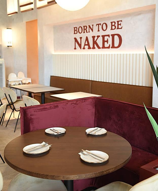 Naked and Sated es un lugar que bebe de la estética retro. Los detalles de terrazo y unas lámparas arqueadas que nos recuerdan a un icónico diseño de Castiglioni de los años 60 nos dan las primeras pistas. Hay una barra de mármol, sillas de líneas depuradas y sofás semicirculares de terciopelo granate escoltados entre maceteros de plantas tropicales. Un ambiente ecléctico que se completa con otros letreros próximos a los baños, en los que también podemos leer guiños a la filosofía saludable del restaurante. El local guarda ciertas similitudes con los otros dos que la cadena tiene en Madrid, y es que todos han sido decorados por el estudio de interiorismo 'TAKK Group'. El rasgo que los diferencia, sin embargo, es un mural de la ilustradora local Ruth Juan, cuyo nombre artístico es 'Junita Makina'. La artista ha plasmado una obra de colores vibrantes en dos de las paredes próximas a la puerta de entrada, que representan «la comida al desnudo», según nos ha explicado el equipo.