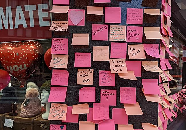 Los bilbaínos han querido celebrar San Valentín dejando bonitas dedicatorias para sí mismos en el escaparate de dos comercios de Rodríguez Arias