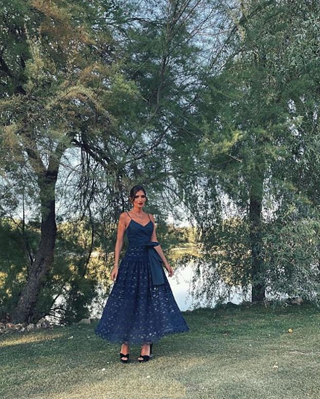La periodista ha escogido el vestido Potenza, de Silvia Tcherassi ,una conocida diseñadora colombiana afincada en Miami. Está confeccionado en tafetán con ojales azul marino, un tono muy bilbaíno que cada día está más presente en la elección de las invitadas más elegantes. Este diseño en concreto, tiene un escote en forma de 'v', tirantes espagueti y un espectacular lazada a la cintura que acentúa la silueta de la periodista. Además, se pone el acento en una voluminosa falda troquelada de largo 'midi'.¿Su precio? 2.700 euros.