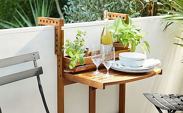Este consejo está dirigido a los balcones con espacios súper reducidos. Si quieres poner una mesita con sillas en el balcón, elige una plegable (que se pueda plegar cuando no la necesites) o, si el espacio es extremadamente pequeño, coloca una balda en la barandilla para desayunar o merendar durante los días más calurosos del año.