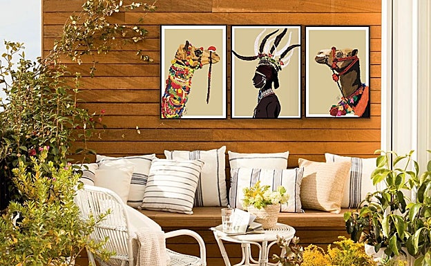 Si en lugar de una mesa con sillas prefieres crear un rincón en el que descansar y sentarte a leer un buen libro, elige un sillón o un pequeño sofá, colócalo en un rincón de la terraza y añade una pequeña mesita para el café. Paralelamente, y para una solución más 'boho', puedes optar por seleccionar unos 'pufs' o cojines en el suelo con una bonita alfombra Si el balcón o la terraza es grande, puedes apostar por una hamaca colgante. Toma nota, por ejemplo. de la propuesta de Celia Erice, fundadora de Pinbleta, con estos hermosos lienzos complementando al resto de la decoración.