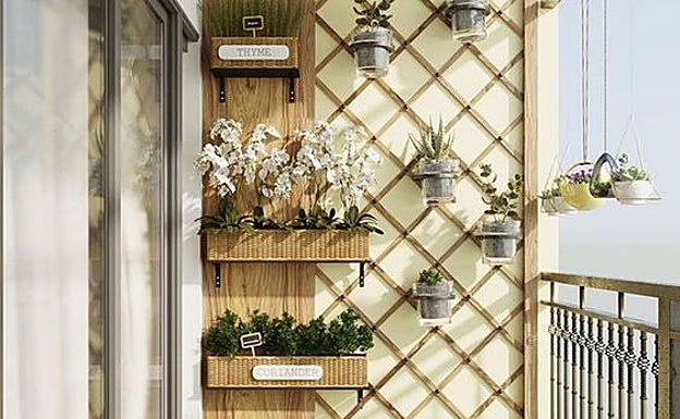 Puedes utilizar el espacio vertical de las paredes para colgar macetas y hierbas aromáticas. Además, para obtener un efecto súper 'chic', también podrás colgar algunas luces o velas, creando un ambiente muy íntimo y acogedor por la noche. Y no te olvides de utilizar las barandillas para colgar flores y plantas. Aportarán mucho color al exterior.